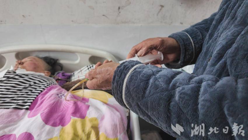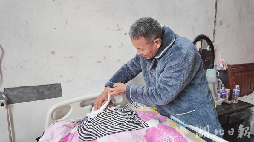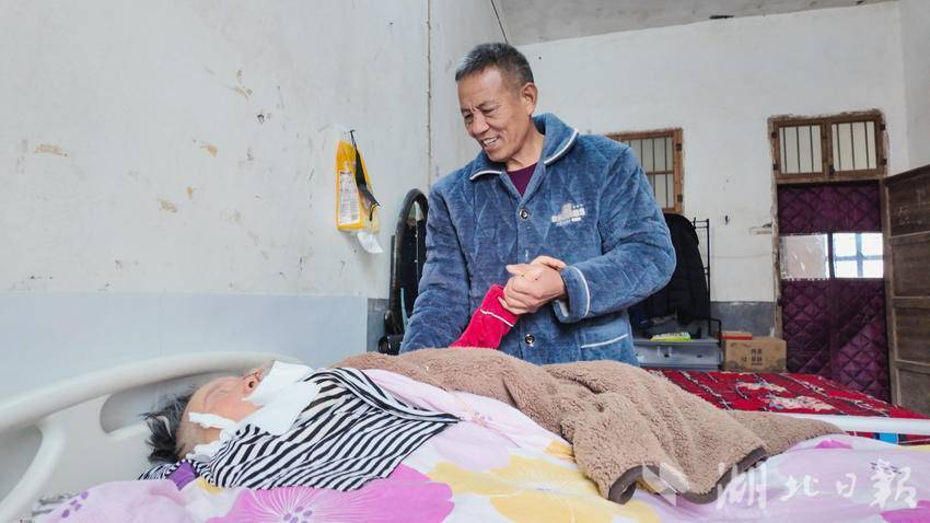 湖北日报客户端讯(通讯员田明 徐功频 邹亚峰)在崇阳县青山镇西冲村的一间农家小院里,63岁的揭金水每天重复着同样的生活节奏:清晨六点起床,烧好温水为妻子擦身、翻身,将精心搭配的食材打成糊状,通过鼻饲管缓缓喂给卧床的爱人;中午趁着阳光正好,给妻子按摩僵硬的肢体,轻声讲述村里的新鲜事;夜晚定时起身查看被褥干湿,为妻子清理污物——这样的日子,他已坚守了整整6年。病床上的59岁妻子陈七兰,因6年前突发脑动脉瘤术后成为植物人,丈夫揭金水用日复一日的精心陪护,诠释着“执子之手,与子偕老”的真谛。